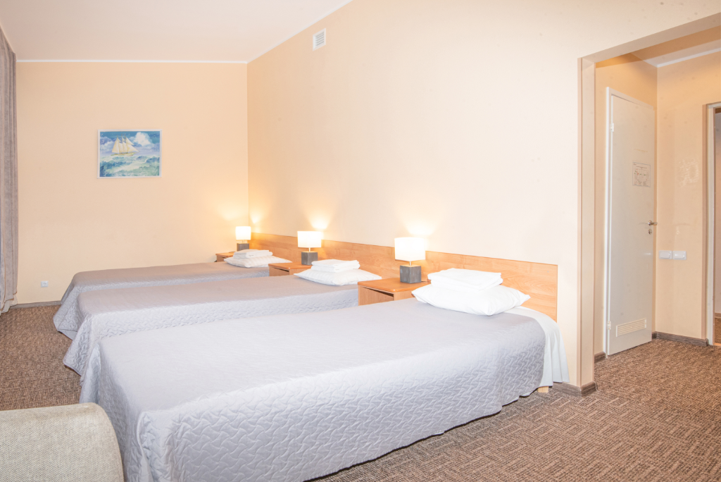 Hele ja mugav 21 m² tuba, mis sobib ideaalselt kuni kolmele külalisele. Kolme eraldi üksikvoodiga tuba on suurepärane valik sõpradele, kolleegidele või peredele vanemate lastega. Kõik, mis on vajalik meeldivaks ja lõõgastavaks peatumiseks, on olemas.